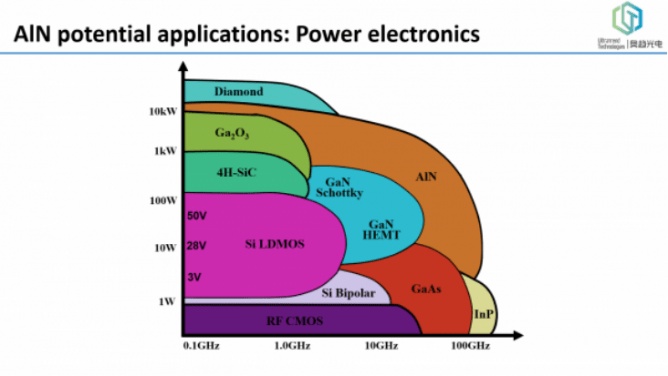 氮化鋁(AlN)是極具戰略意義的新一代超寬禁帶半導體材料,具有超寬禁帶(6.2 eV)、高熱導率(340 W/(m∙K))、高擊穿場強(15.4 MV/cm)、高熱穩定性及良好的紫外透過率等優異性能(見圖三),是高功率、高頻及高壓器件(見圖四)的理想襯底材料,同時也是紫外光電器件的最佳襯底材料。據康奈爾大學報導,AlN基功率器件的綜合性能有著其它寬禁帶半導體材料所無可比擬的優勢與效率,被認為是下一代功率器件材料平臺;由于AlN耐壓能力約為SiC的5倍、GaN的3倍及金剛石的1.5倍,日本NTT公司于2022年首次使用高質量AlN單晶襯底制備出了全球首款耐壓1700V、耐溫高達500℃的新一代晶體管,并表示有望將功率器件電力損耗降至Si的5%以下、SiC的35%以下和GaN的50%以下;近期,諾貝爾獲獎者天野浩教授團隊基于AlN單晶襯底首次實現了室溫下連續波深紫外激光輸出。這些突破性成果代表基于AlN單晶襯底的技術向未來產業化廣泛應用奠定了堅實基礎。
