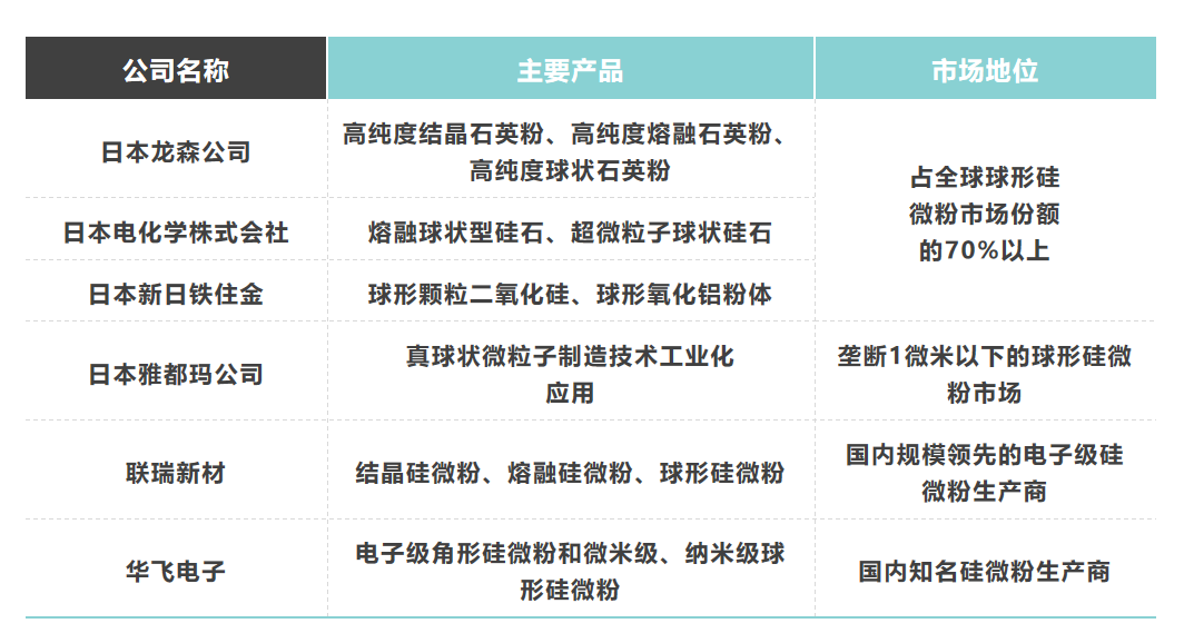 全球高端硅微粉以海外廠商為主,國內龍頭企業快速發展。日本公司在硅微粉市場特別是技術壁壘更高的電子級硅微粉市場及應用方面經驗豐富,具備先發優勢。其中日本龍森公司、日本電化學株式會社、日本新日鐵住金三家企業占據全球球形硅微粉70%的份額。日本雅都瑪公司壟斷了1微米以下的球形硅微粉填料市場。國內較大的硅微粉企業主要分布在江蘇連云港、安徽鳳陽和浙江湖州等地,其中連云港東海縣在國內最早開始進行電子級硅微粉的生產開發,是國內最大的硅微粉生產基地。國內目前處于領先地位的企業包括聯瑞新材、華飛電子等。