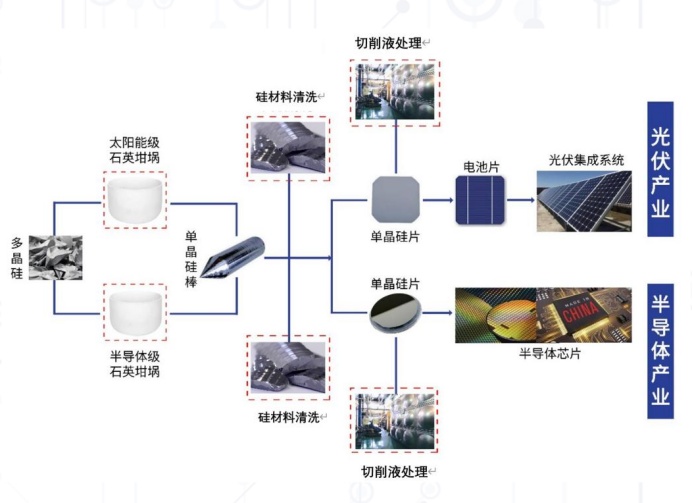 切削液處理服務:對使用后的硅片切削液的回收利用,去除切割后DW冷卻切削液中的雜質,并補充新的切削液及去離子水,進而得到符合要求的DW冷卻切削液,從而實現多次利用。