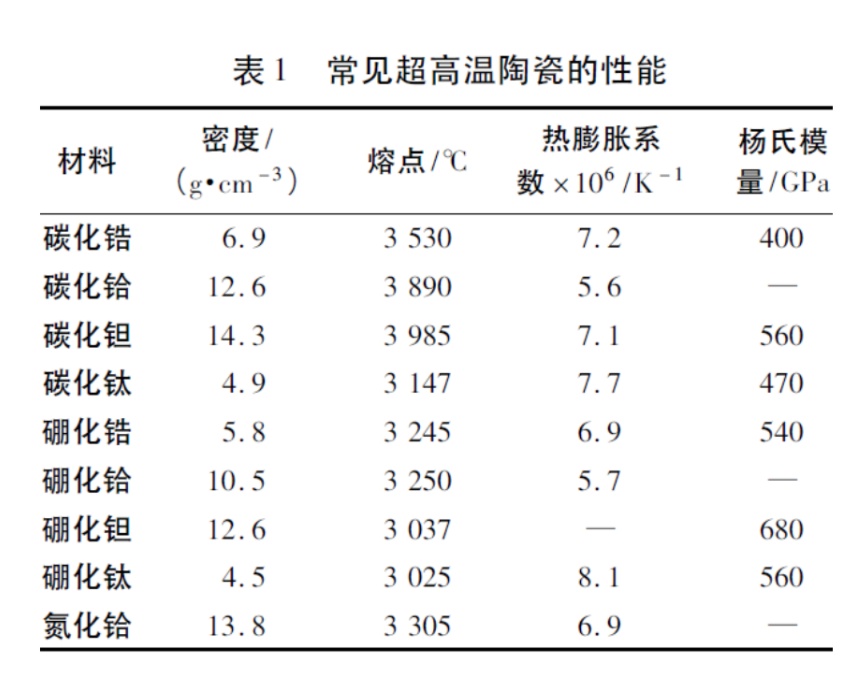 超高溫陶瓷因其較難熔金屬密度更小、承受溫度更高,較炭/炭(C/C)或炭/碳化硅(C/SiC)復合材料抗氧化燒蝕性能更優異,而受到了國內外學者的極大關注。它主要應用于高超音速導彈、航天飛機等飛行器的熱防護系統,作為翼前緣、端頭帽以及發動機的熱端,是難熔金屬、C/C、C/SiC的最佳替代者,也是超高溫領域非常有發展潛力的一類材料。
