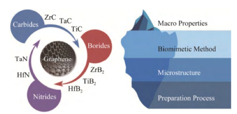 超高溫陶瓷熱沖擊性能差,根本原因就是在高溫極端條件下,晶須和纖維等傳統增韌相的損傷和失效,而石墨烯優異的力學和熱學性能可以提高陶瓷基復合材料的韌性和熱力學性質。而恰恰石墨烯的增韌作用使其能夠抵抗由于熱沖擊、化學侵蝕和高速等離子體流造成的開裂,進而改善了其抗熱震性能。