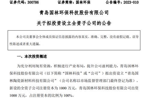中國粉體網訊 近日,國林科技(300786)發布公告,為充分利用現有資源,積極進行產業布局,提升公司盈利能力,擬出資設立“青島國林陶瓷新材料科技有限公司”(公司名稱以市場監督管理部門最終登記為準)。新設的全資子公司注冊資本為 1000 萬元,青島國林環?萍脊煞萦邢薰境鲑Y1000 萬元,占注冊資本的比例為 100%。