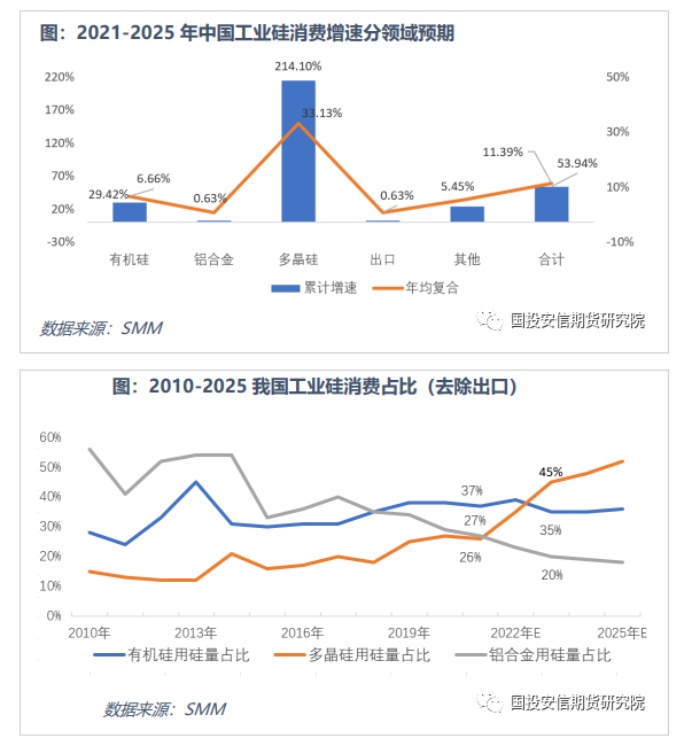 未來供需格局:供應端來看,在未來供需矛盾紓解,產能利用率以及新增產能的投放是否會超預期,客觀環境如雙控政策、不可抗力等成為重要的影響因素。目前來看,2022年工業硅市場的供需缺口仍然存在,整體市場向陽生長。從需求端來看,未來光伏產業的發展拉動工業硅需求爆發增長,未來多晶硅領域的耗硅量占比有望超過有機硅,多晶硅成為工業硅消費主力軍。