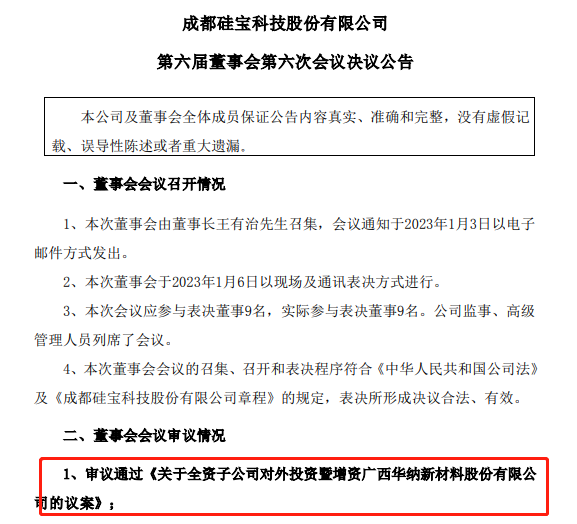 中國粉體網(wǎng)訊 1月6日,硅寶科技公告,全資子公司硅寶投資擬以3000萬元對廣西華納新材料股份有限公司進行增資,增資款專項用于目標公司擴產(chǎn)及日常生產(chǎn)經(jīng)營。