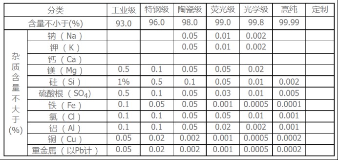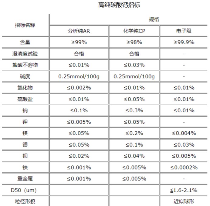 碳酸鈣以傳統(tǒng)造紙、塑料、涂料、橡膠、膠粘劑等應(yīng)用市場為主,這其中也應(yīng)用高純超細(xì)碳酸鈣,不過在電子陶瓷等高端應(yīng)用中的碳酸鈣遍更細(xì)、更純、分散性好、比表面積大。以某企業(yè)對高純碳酸鈣的劃分為例,碳酸鈣含量93.0為工業(yè)級,96.0為特鋼級,98.0為陶瓷級,99.0為熒光級,99.8為光學(xué)級,99.99為高純。按照國家和主管部門頒布的化學(xué)品純度質(zhì)量指標(biāo),碳酸鈣也可分為,優(yōu)級純99.8%(GR)、分析純99.7%(AR)和化學(xué)純≥99.5%(CP)3種。除此之外,在實(shí)際應(yīng)用中企業(yè)對碳酸鈣純度的要求也各有不同,如醫(yī)藥材料99.0%,電子材料99.5%,化學(xué)試劑99.3%,高純鈣鹽合成99.99%等。從雜質(zhì)方面分析,現(xiàn)國內(nèi)市場碳酸鈣含量大多≤99.9%,主要是雜質(zhì)鐵、鎂、硅(含量300-1500PPm之間)以及重金屬等。