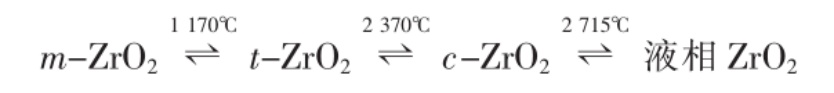 ZrO2具有多晶型的相結構,低溫為單斜晶系(m-ZrO2),高溫為四方晶系(t-ZrO2),更高溫度下為立方晶系(c-ZrO2),3種晶型相互間的轉化關系如下: