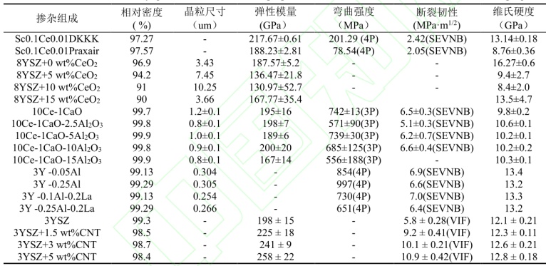 不同元素摻雜量氧化鋯陶瓷的相對密度、晶粒尺寸與力學性能