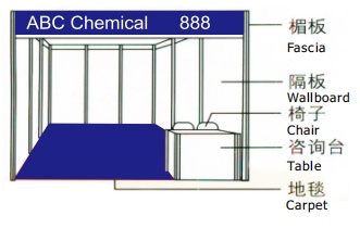 ·普標展位配置:3面壁板(轉角位為兩面,高2.5米)、中英文楣牌制作、1桌2椅、 地毯滿鋪、日光燈管2個、廢紙簍1個。
