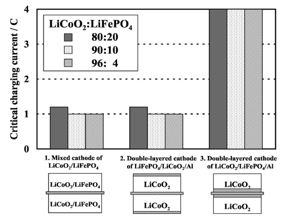 層狀材料因其高能量密度常用作動力電池的正極材料,但因為熱穩定性差,限制了其進一步發展和應用。研究人員將層狀鈷酸鋰和磷酸鐵鋰共混,提出了一種獨特的共混方法來提高層狀材料的安全性,如圖1所示,他們演示了一種鈷酸鋰和磷酸鐵鋰的雙層電極,其中磷酸鐵鋰層既用作活性材料又用作過充和熱失控保護的電阻性阻擋層,該共混電極不僅提升耐過充電流,且能將過充時的表面溫度降至80℃,從而顯著提升鈷酸鋰的安全性。研究發現,當LiCoO2和LiMn2O4以質量比為3:2共混時成本大幅下降,且穩定容量高達137mAh/g,同時過充循環5圈后容量保持率達92.3%。鈷酸鋰與磷酸鐵鋰按照質量比1:1共混時,耐過充性能和熱穩定性均明顯提升,3C/10V條件下過充,其僅發生鼓脹,而無發煙和起火現象;且短路和過充條件下,共混材料的表面溫度明顯低于鈷酸鋰材料。