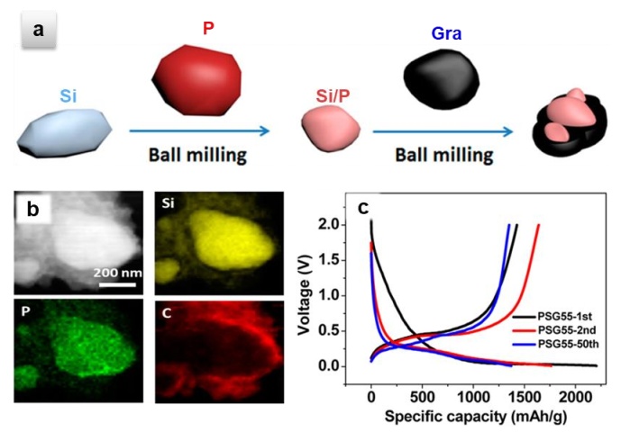 圖2 石墨與硅(摻雜磷)室溫復合材料的(a)合成示意圖,(b)EDX圖譜和(c)充放電曲線