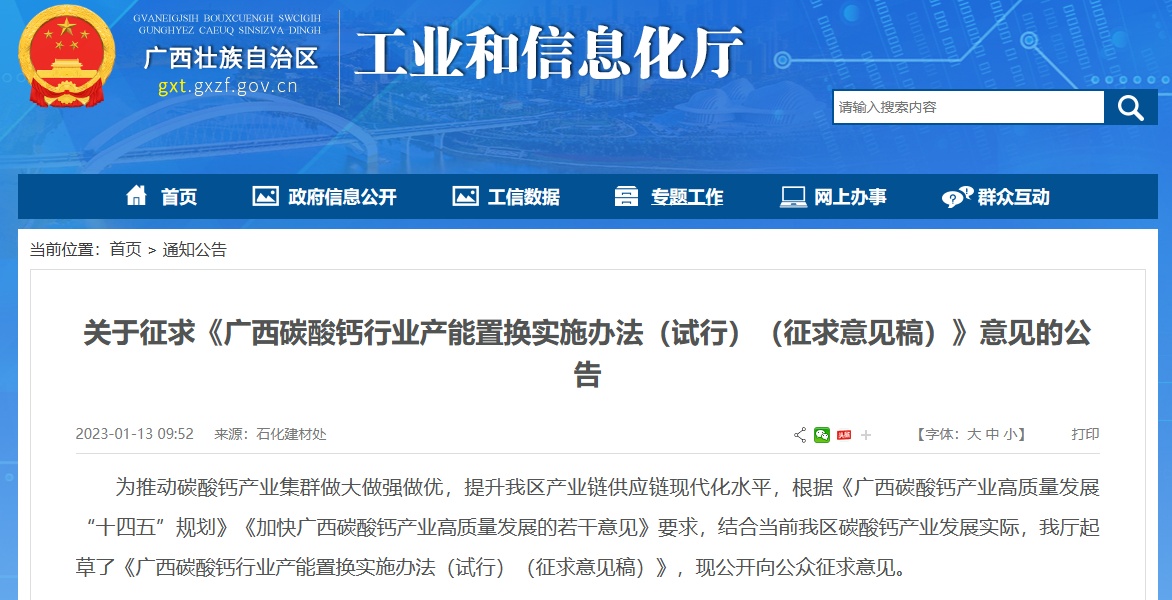 中國粉體網訊 日前,廣西工信廳發布《廣西碳酸鈣行業產能置換實施辦法(試行)(征求意見稿)》,明確提出,嚴禁備案和建設擴大產能的碳酸鈣粉體加工項目,確有必要建設的,必須制定產能置換方案,實施產能置換。