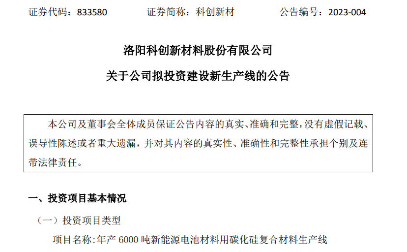 中國(guó)粉體網(wǎng)訊 2月13日,洛陽(yáng)科創(chuàng)新材料股份有限公司(簡(jiǎn)稱(chēng):科創(chuàng)新材)發(fā)布公告。公告稱(chēng)科創(chuàng)新材擬投資1.3億元,建設(shè)年產(chǎn)6000噸新能源電池材料用碳化硅復(fù)合材料生產(chǎn)線。