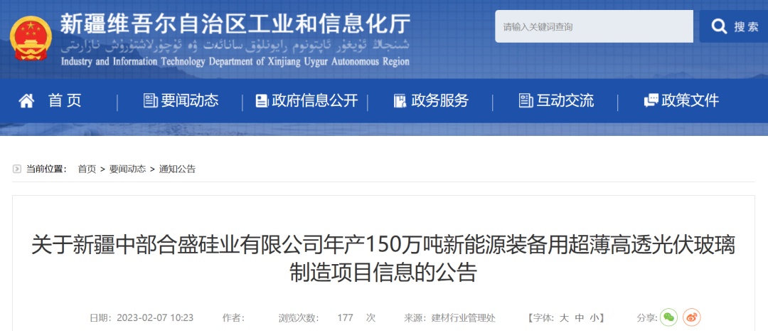 2月7日,新疆工信廳發(fā)布關于新疆中部合盛硅業(yè)有限公司年產150萬噸新能源裝備用超薄高透光伏玻璃(1525, -4.00, -0.26%)制造項目信息的公告。公告稱,根據(jù)工業(yè)和信息化部和國家發(fā)展改革委風險預警意見,結合聽證意見,新疆自治區(qū)工業(yè)和信息化廳、新疆自治區(qū)發(fā)展改革委于2023年1月9日至1月28日,對新疆中部合盛硅業(yè)有限公司年產150萬噸新能源裝備用超薄高透光伏玻璃制造項目進行了公示,公示期間無異議。結合風險預警意見、聽證意見及公示情況,同意新疆中部合盛硅業(yè)有限公司年產150萬噸新能源裝備用超薄高透光伏玻璃制造項目建設實施。