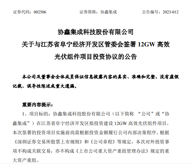 2月15日晚,協(xié)鑫集成發(fā)布公告,公司與江蘇省阜寧經濟開發(fā)區(qū)管委會簽訂了《12GW 高效光伏組件項目投資協(xié)議》,就公司在阜寧經濟開發(fā)區(qū)投資建設 12GW 高效光伏組件項目達成合作意向。