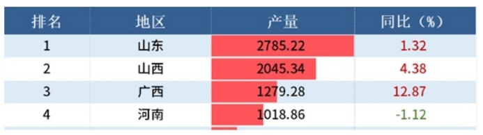 產量方面,國家統計局數據顯示,2022年中國氧化鋁產量8186.2萬噸,同比增長5.6%。其中,2022年山東產量為2785.22萬噸、山西產量2045.34萬噸、廣西產量1279.28萬噸和河南產量1018.86萬噸,產量分別同比增長1.32%、4.38%、12.87%和-1.12%。