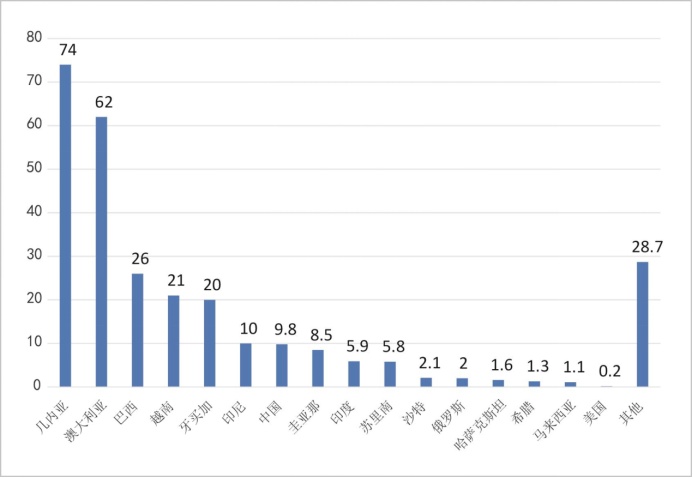 世界主要國家鋁土礦儲量分布表(萬噸)(數據來源:USGS)
