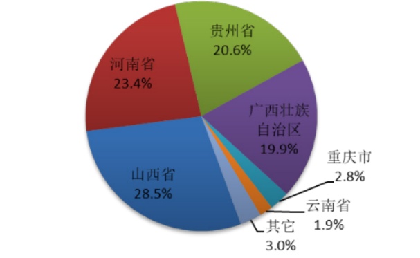 我國鋁土礦查明資源儲量分布于19個省(區),資源分布比較集中的有山西、廣西、貴州、河南、重慶以及云南,前4個省區的鋁土礦資源儲量占全國的90%以上。