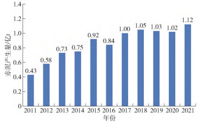 赤泥是氧化鋁生產過程中產生的強堿性固體廢渣,含大量氧化鐵,顯紅色。中國作為氧化鋁生產大國,根據國家統計局等相關資料顯示,自2017年起,我國每年產生的赤泥均超過1億t。