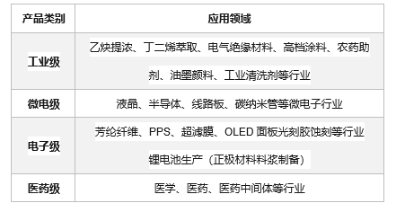 NMP產品根據產品應用領域可分為工藝級、微電級、電子級和醫藥級等。而電子級NMP市場需求約占NMP總需求的80%。