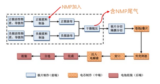 NMP在鋰離子電池行業的應用主要是在正極料漿制備(配料)和涂布階段。