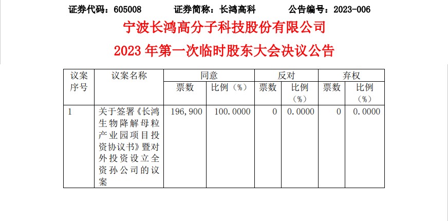 2月16日,長鴻高科發布2023年第一次臨時股東大會決議公告,本次股東大會表決通過了“關于簽署<長鴻生物降解母粒產業園項目投資協議書>暨對外投資設立全資孫公司的議案”。這也意味著長鴻高科可降解塑料全產業鏈上下游一體化布局又邁出關鍵一步,再獲實質性進展。
