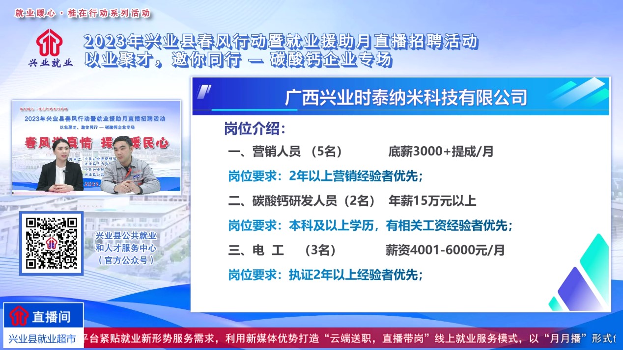 “非常感謝縣委、縣政府為我們碳酸鈣企業提供的招聘機會,希望通過與求職者的在線互動,吸引更多人才加入我們的生產隊伍。”廣西興業時泰納米科技有限公司招聘負責人滿治添感激地說道。