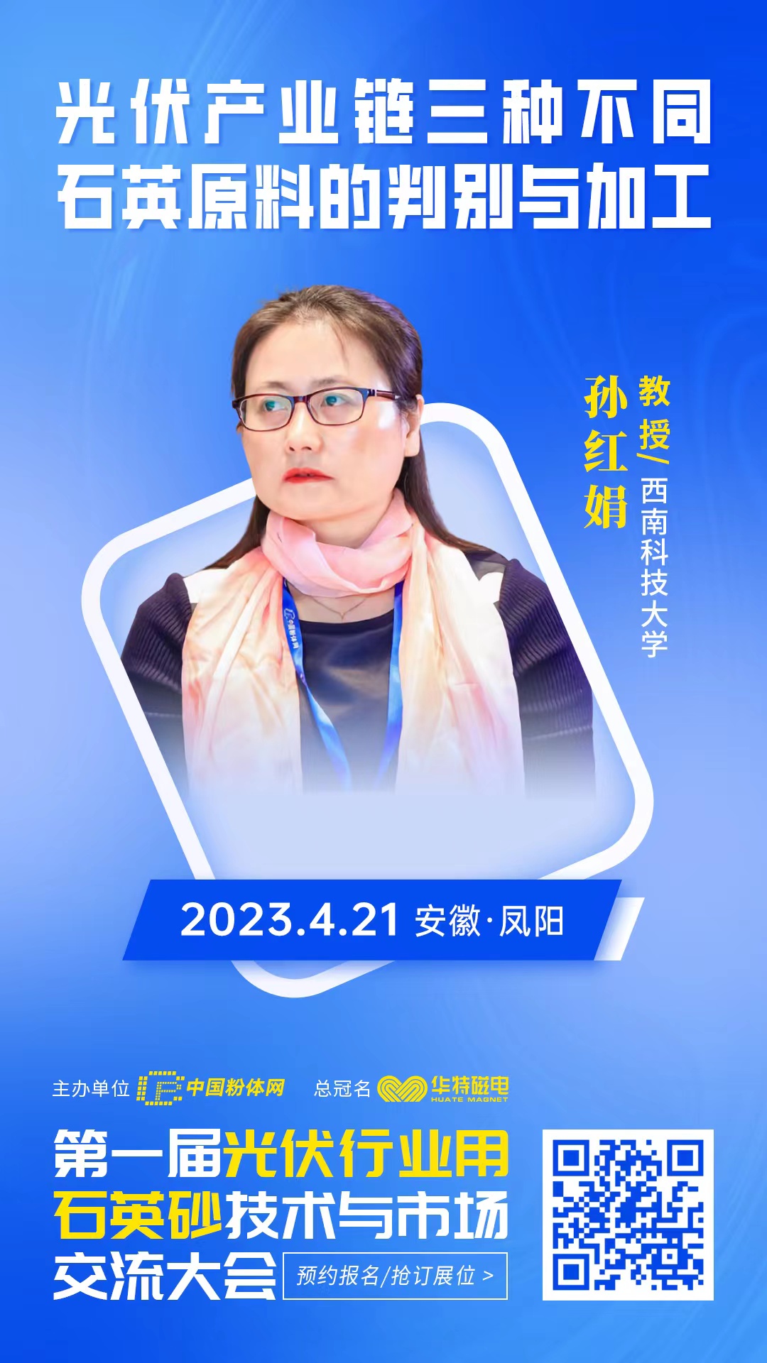 2023年4月21日,中國粉體網將在安徽鳳陽舉辦“第一屆光伏行業用石英砂技術與市場交流大會”。西南科技大學孫紅娟教授將帶來題為《光伏產業鏈三種不同石英原料的判別與加工》的報告,屆時,她會詳細介紹光伏行業中石英原料的判別與加工方法。