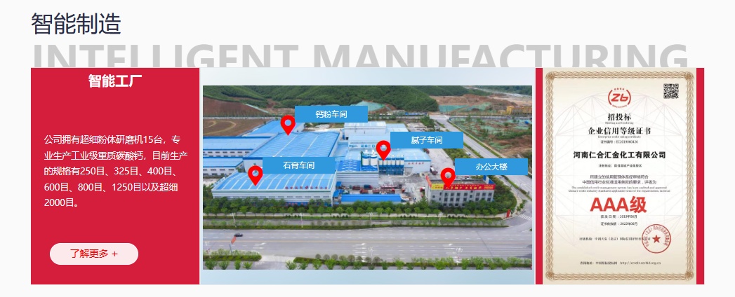河南仁合匯金化工有限公司,公司成立于2010年12月,位于有“中國鈣都”之稱的河南省南召縣,距二廣高速路口一公里,交通便利,位置優越,廠區占地面積約50余畝左右,環境優美,現有職工200余人左右。是一家集礦山開采,重質碳酸鈣生產,建筑輔材技術研發,生產,銷售于一體的高新技術企業。