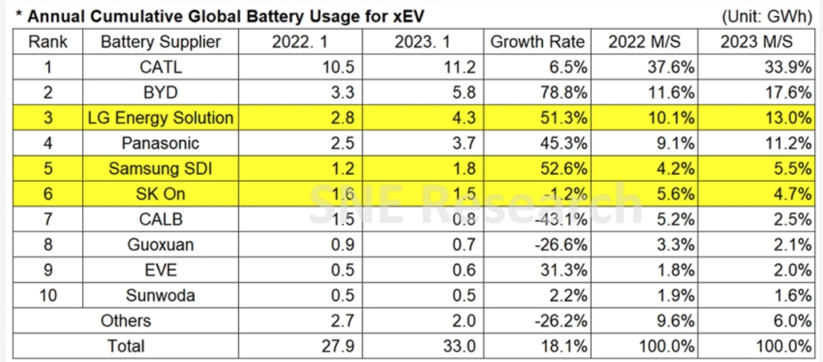 SNE Research指出,由于2023年新能源汽車補貼政策的中斷,中國1月份電動汽車(BEV+PHEV)的銷售量與去年同期相比減少了6.2%,但以寧德時代和比亞迪為首,中國電池企業(yè)仍然引領(lǐng)著市場。