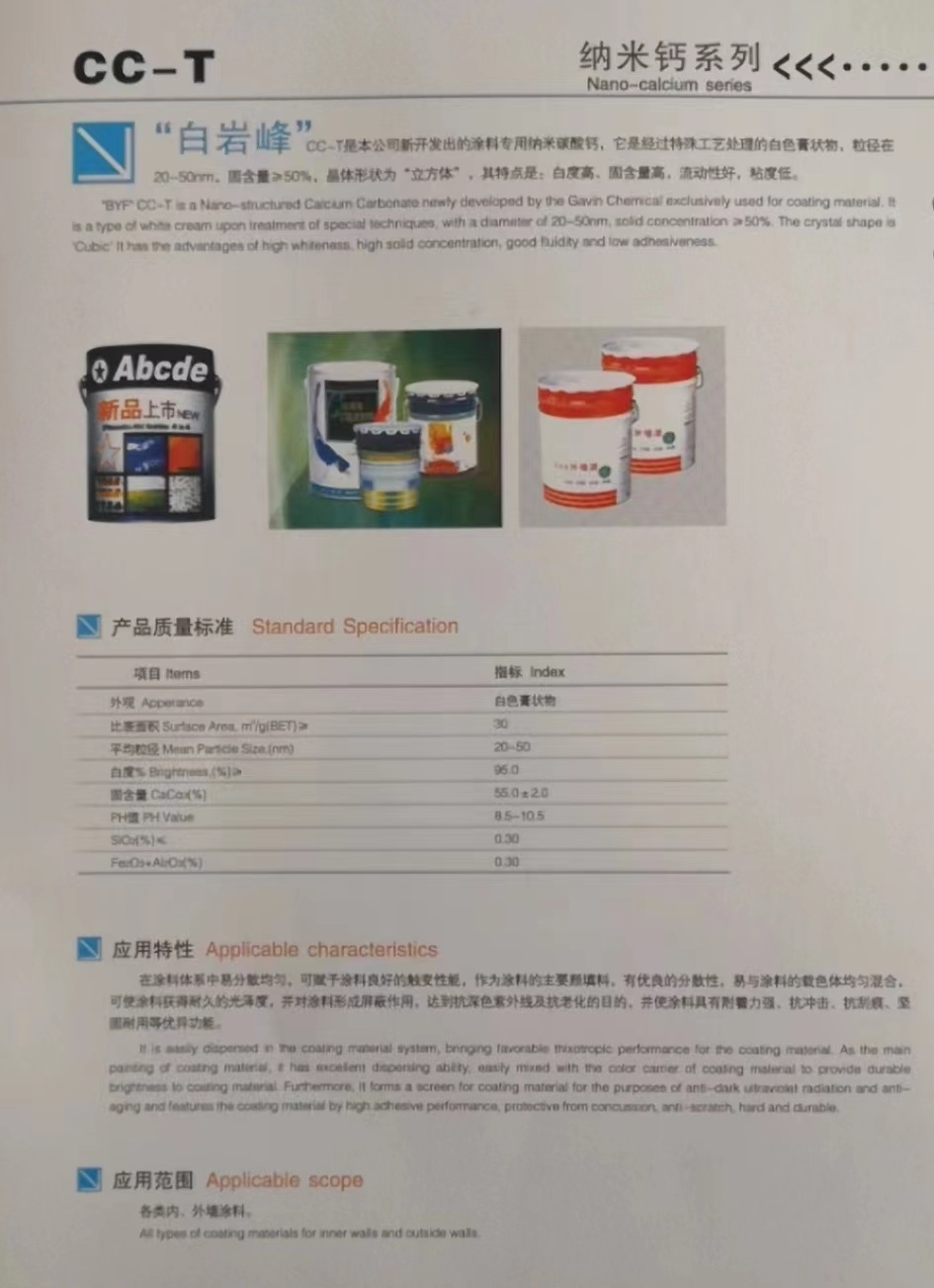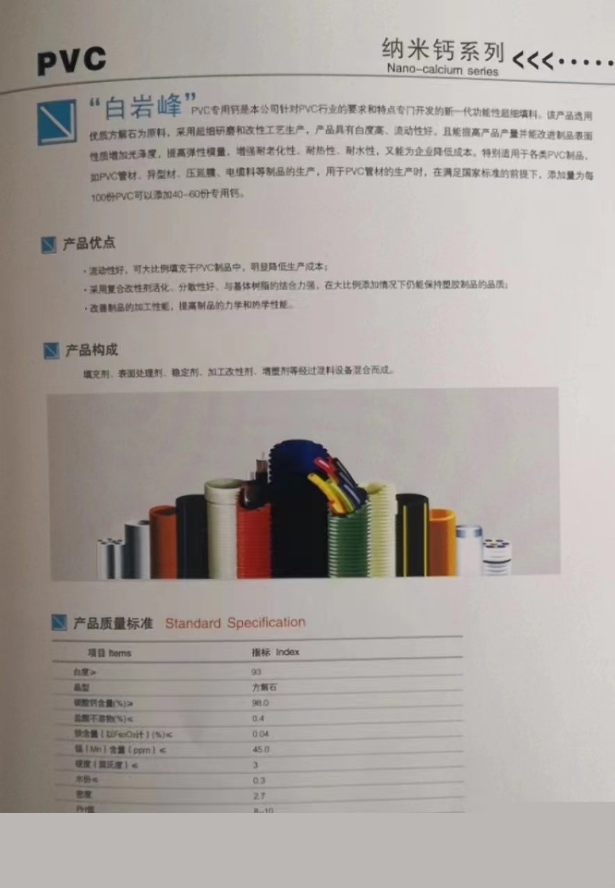 本公司專業研發和生產各種復合粉體專用鈣系列、納米鈣系列、重鈣系列、輕質沉淀碳酸鈣系列、輕質活性碳酸鈣系列產品,年產量5萬噸。白巖峰牌納米(活性)碳酸鈣系列產品: CC、CC-R、CC-OT超細重質(活性)碳酸鈣系列產品:YF-1000、YF-1250、YF-1500、 YF-2000。所有產品均在生產基地選用優質石灰石、方解石為基礎原料,并與國內外多家科研發機構進行技術交流與合作,產品具有白度高、化學性能穩定、粒子均勻、分散性強等特點,廣泛用于涂料、塑料、橡膠、油墨、密封膠、化纖等工業領域。