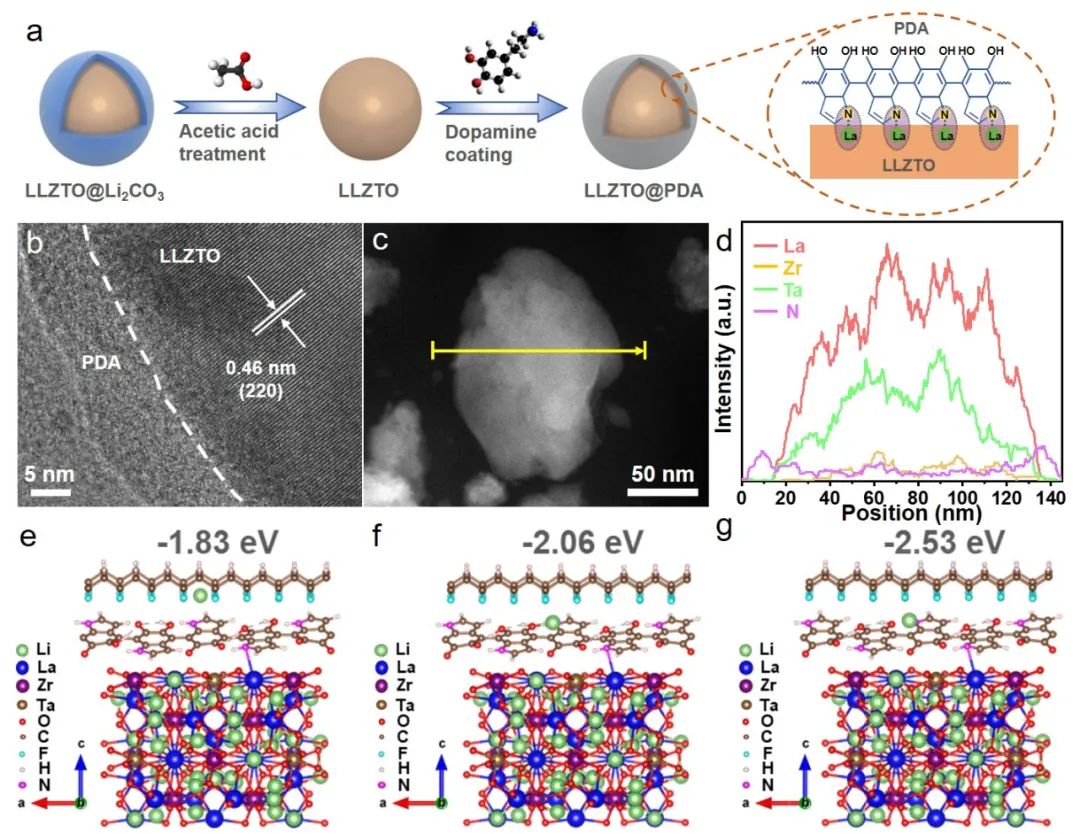 本研究通過(guò)在去除殘堿的石榴石表面上沉積10nm聚多巴胺涂層,增加石榴石電解質(zhì)在空氣中的穩(wěn)定性。石榴石的鑭原子和聚多巴胺的氨基之間存在大量的金屬-氮化學(xué)鍵,導(dǎo)致鋰離子在異質(zhì)界面上的吸附更強(qiáng),激活了石榴石-聚多巴胺界面的電荷分布,形成了一種粒子間鋰離子快速傳導(dǎo)機(jī)制。制備的復(fù)合固態(tài)電解質(zhì)呈現(xiàn)出較高的鋰轉(zhuǎn)移數(shù)約0.60、高室溫鋰離子傳導(dǎo)率1.52*10-4S/cm和高截止上限電壓4.6V,以支持全固態(tài)高電壓鈷酸鋰(Li-LiCoO2)電池的穩(wěn)定運(yùn)行。本研究為設(shè)計(jì)高性能全固態(tài)鋰金屬電池提供了新的途徑。