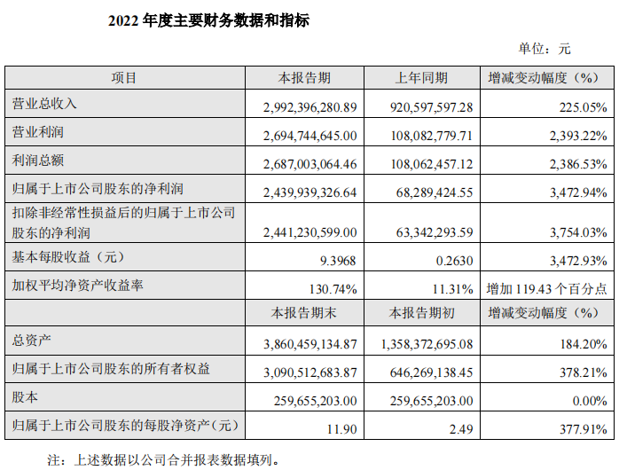 中國(guó)粉體網(wǎng)訊 3月14日,融捷股份發(fā)布業(yè)績(jī)快報(bào)。根據(jù)公告,2022年融捷股份實(shí)現(xiàn)營(yíng)業(yè)總收入約29.92億元,同比增長(zhǎng)225.05%;歸屬于上市公司股東的凈利潤(rùn)約24.4億元,同比增長(zhǎng)3472.94%;扣除非經(jīng)常性損益后的歸屬于上市公司股東的凈利潤(rùn)24.41億元,同比增長(zhǎng)3754.03%;公司基本每股收益約9.4元,同比增長(zhǎng)3472.93%。