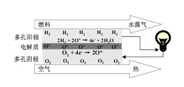 陶瓷燃料電池,即固體氧化物燃料電池(SOFC),是一種將燃料與氧化劑中的化學能直接轉換成電能的全固態電化學發電裝置,其中,SOFC的電解質、陰極和陽極都涉及陶瓷材料,因此SOFC又被稱為陶瓷燃料電池。其原理為:在固體氧化物燃料電池的陽極一側持續通入燃料氣,例如:氫氣(H2)、甲烷(CH4)、煤氣等,具有催化作用的陽極表面吸附燃料氣體,并通過陽極的多孔結構擴散到陽極與電解質的界面。在陰極一側持續通入氧氣或空氣,具有多孔結構的陰極表面吸附氧,由于陰極本身的催化作用,使得O2得到電子變為O2-,在化學勢的作用下,O2-進入起電解質作用的固體氧離子導體,由于濃度梯度引起擴散,最終到達固體電解質與陽極的界面,與燃料氣體發生反應,失去的電子通過外電路回到陰極。