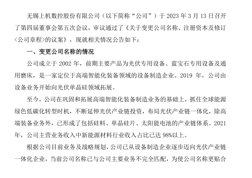 提及更名原因,上機數控表示,根據公司目前業務及戰略規劃,公司已從設備制造企業逐步邁向光伏產業鏈一體化企業,當前公司名稱已與公司主要業務不完全匹配,為使公司名稱更貼合實際情況,進一步提升公司品牌競爭力并協同體系內公司品牌管理為目標,經研究決定變更公司名稱。