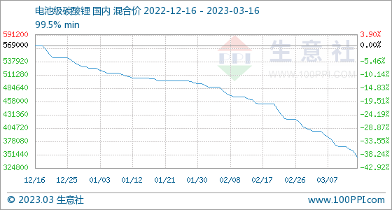 據生意社最新數據,3月16日,部分鋰電材料報價繼續下跌,其中電池級碳酸鋰基準價為34.7萬元/噸,與本月初相比,下降了14.95%,創下了近一年以來的價格新低。