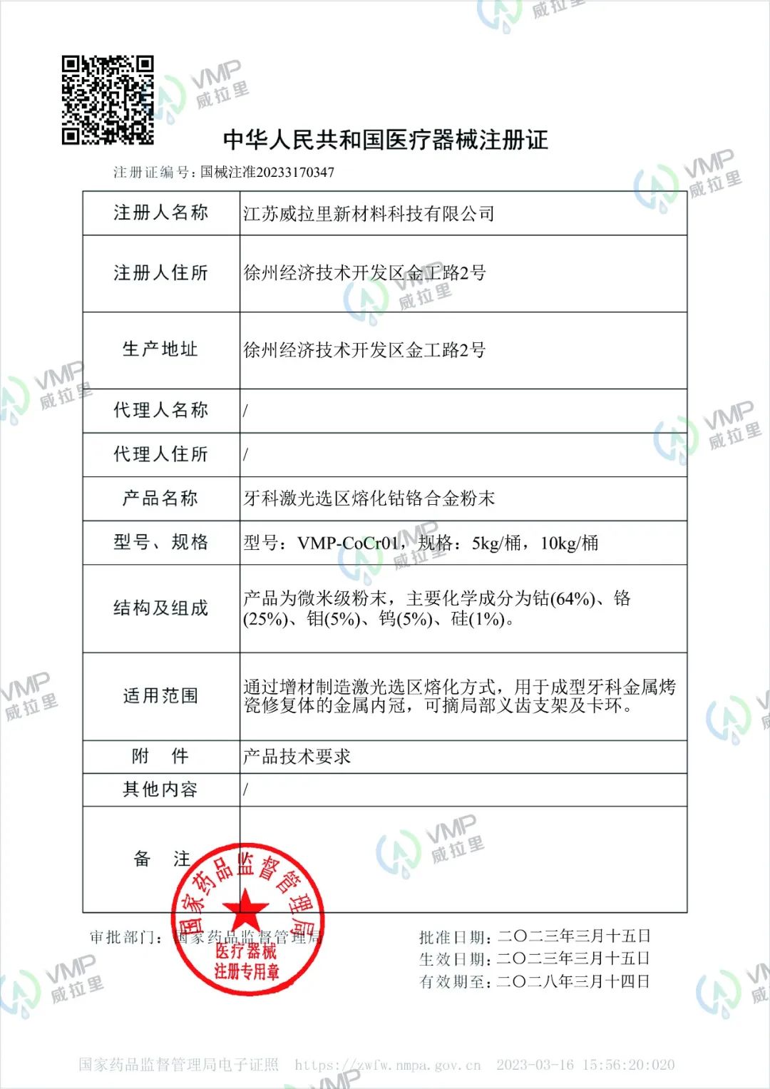 中國粉體網訊 中國粉體網獲悉,近日,威拉里獲批由國家藥監局簽發的三類醫療器械產品“牙科激光選區熔化鈷鉻合金粉末”注冊證,標志著威拉里可為義齒加工企業提供高品質的增材制造用鈷鉻合金粉末。