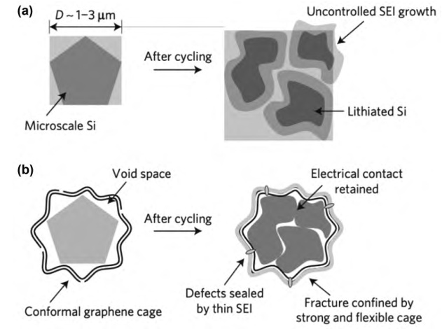 也有研究人員利用毛細作用將硅納米顆粒包裹在石墨烯中,形成膠囊結構容納硅的體積膨脹而不發生斷裂,從而有助于保護硅納米顆粒免受絕緣固體電解質界面的過度沉積。與裸硅納米顆粒相比,這些硅石墨烯膠囊表現出較高的容量保持能力、良好的循環穩定性和優異的庫倫效率。
