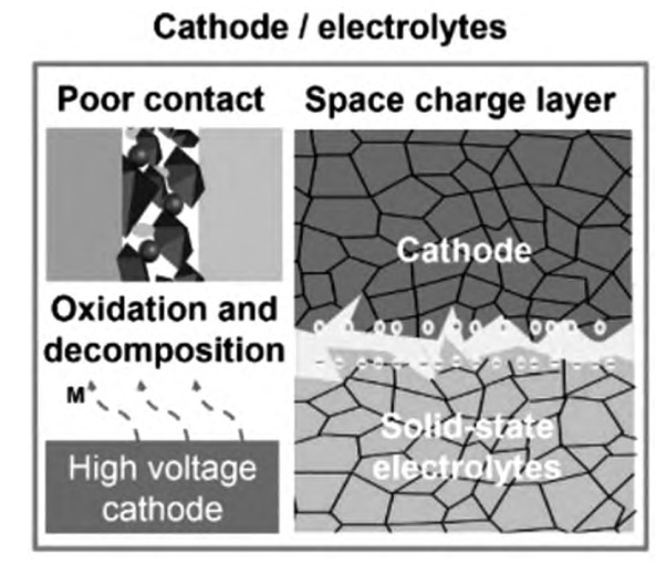 為抑制鋰枝晶的生長等,固態電解質一般都有一定的機械強度,但是這樣也使其和正極之間形成了點接觸(見圖3),界面相容性較差。正極接觸氧化物基固態電解質時,因為氧化物基固態電解質的硬度較高,循環時會出現晶格不匹配、電極體積發生變化等現象。正極配合硫化物基固態電解質時容易使界面處產生空間電荷層。氧化物正極與氫化物固態電解質接觸時,易被還原。