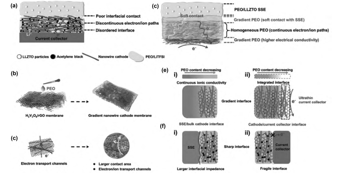 為了構建正極與固體電解質之間的良性界面接觸和規整的電子/離子傳輸通道,研究人員設計了一種梯度納米線(NW)正極。在正極的兩面構建PEO梯度分布界面,作為界面緩沖層(圖4)。一側表面具有更多的離子導電聚合物與電解質平滑接觸,另一側表面具有更多的電子導電H2V3O8NWs/rGO,集流體提供快速的電子傳輸。并且正極材料內部間隙被rGO和PEO基固態聚合物電解質均勻填充,這種結合將正極/固態電解質之間的點對點接觸轉變為大面積接觸。由于正極/電解質、正極/集流體和正極內部結構的改性,具有這種梯度NW正極膜的全固態鋰離子電池具有更高的鋰離子擴散效率、更低的阻抗和優異的循環穩定性。
