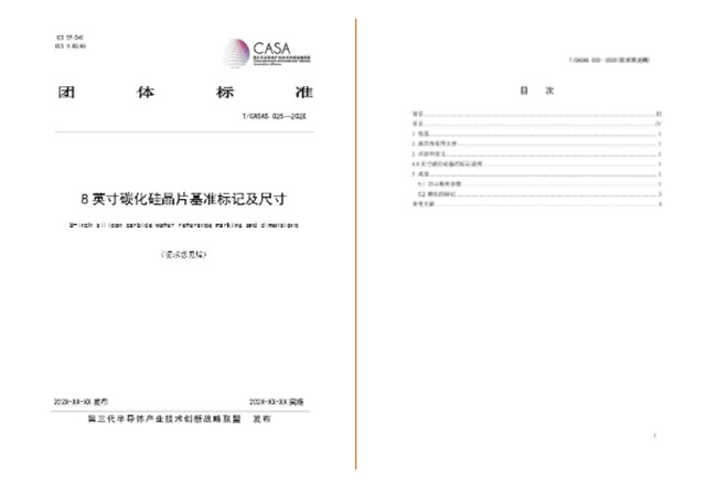 T/CASAS 025—202X《8英寸碳化硅晶片基準標記及尺寸》規定了8英寸碳化硅單晶切割片、研磨片和拋光片(簡稱“碳化硅晶片”)基準標記及尺寸。適用于4H晶片,產品主要用于制作晶體管、整流器件等。該標準于2022年7月11日正式立項。
