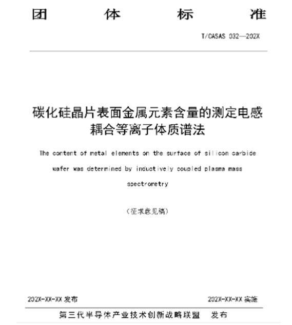 T/CASAS 032—202X《碳化硅晶片表面金屬元素含量的測定電感耦合等離子體質譜法》規定了電感耦合等離子體質譜法測定碳化硅晶片表面金屬元素含量的方法。該標準適用于碳化硅單晶拋光片和碳化硅外延片表面痕量金屬鈉、鋁、鉀、鈣、鈧、鈦、釩、鉻、錳、鐵、鈷、鎳、銅、鋅、銀、鎢、金、汞元素含量的測定,測定范圍為108 cm-2~1012 cm-2。適用于4~8 英寸碳化硅晶片,甚至更大尺寸的晶片。同時也適用于碳化硅退火片等無圖形碳化硅晶片表面痕量金屬元素含量的測定。該項目于2022年11月21日正式立項。