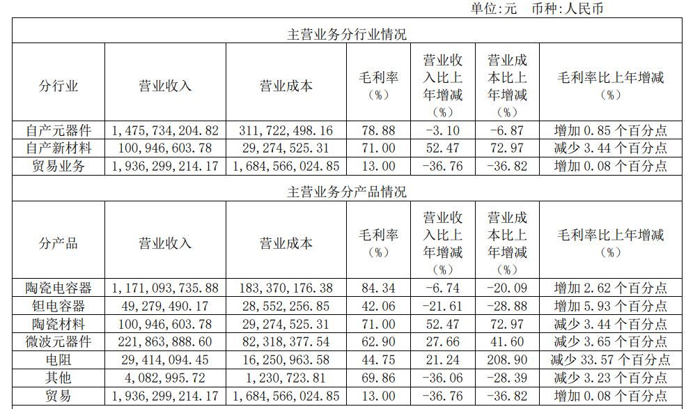 元器件板塊,公司主要是以電容器為主,主要產品是陶瓷電容器、鉭電容器、超級電容器等多系列產品。2022年客戶需求放緩,物流管控、物料運輸等因素受限,訂單量減少。在報告期間內,公司自產元器件業務實現銷售收入14.57億元,同比下降3.10%。