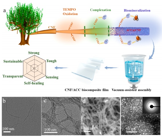 上述工作近期以“Bioinspired Stabilization of Amorphous Calcium Carbonate byCarboxylated Nanocellulose Enables Mechanically Robust, Healable, and SensingBiocomposites”為題發表在ACSNano上。四川大學高分子研究所博士生鄔宛霖和福建師范大學環境科學與工程學院盧至行講師為共同一作,四川大學高分子材料工程國家重點實驗室熊銳特聘研究員和德國康斯坦茨大學HelmutCölfen教授為共同通訊作者。
