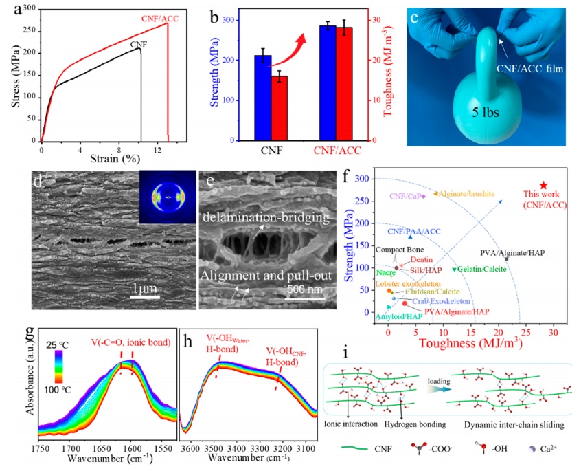 通過表面羧基和剛性分離網絡的協同穩定作用,CNFs表現出長期穩定性(超過一個月),穩定效率分別是羧甲基纖維素(CMC)和海藻酸鹽的3.6倍和4.4倍,甚至高于聚丙烯酸。由此產生的CNF/ACC分散體可以制成透明復合薄膜,強度高達286MPa,韌性高達28.5 MJ/m3,超過了迄今為止報道的合成生物聚合物-碳酸鈣/磷酸鹽復合材料。