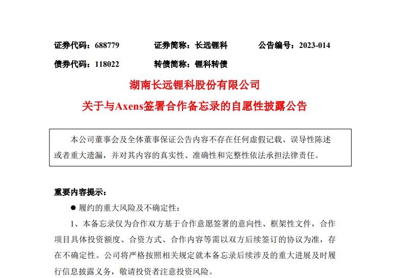 中國粉體網訊 3月27日公告,湖南長遠鋰科股份有限公司近日與Axens Group友好協(xié)商,就后續(xù)在雙方三元正極材料領域進行合作,以促成在歐洲設立正極材料生產工廠事宜簽署了《Memorandumof Understanding》(《合作備忘錄》)。