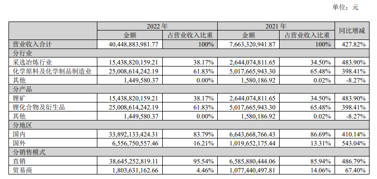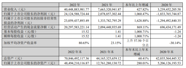 中國粉體網(wǎng)訊 3月30日晚,天齊鋰業(yè)(002466)發(fā)布2022年年度報告,報告期內(nèi),天齊鋰業(yè)實現(xiàn)營業(yè)總收入404.49億元,同比增長427.82%;歸屬于上市公司股東的凈利潤為241.25億元,同比增長1060.47%,扣除非經(jīng)常性損益后的凈利潤為230.59億元,同比增長1628.88%。