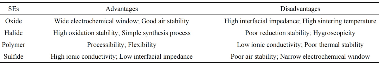 氧化物、鹵化物、聚合物和硫化物固態(tài)電解質(zhì)的優(yōu)缺點(diǎn)(來(lái)源:賈政剛等,《固態(tài)鋰硫電池中硫化物固態(tài)電解質(zhì)的研究現(xiàn)狀》)