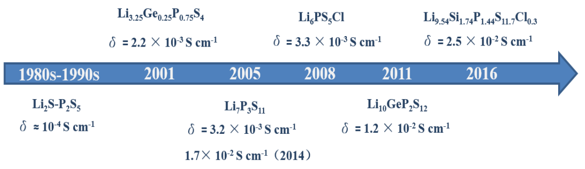 1980s-1990s,以Li2S·P2S5為代表的玻璃態(tài)硫化物固態(tài)電解質(zhì)被開(kāi)發(fā)出來(lái);隨后第一個(gè)晶態(tài)的硫化物固體電解質(zhì)Li3.25Ge0.25P0.7S4在2001年被東京工業(yè)大學(xué)的學(xué)者發(fā)現(xiàn);2005年,大阪府立大學(xué)的學(xué)者合成了玻璃陶瓷電解質(zhì)Li7P3S11;2008年德國(guó)錫根大學(xué)的學(xué)者發(fā)現(xiàn)了硫銀鍺礦型的Li6PS5X(X=Cl、Br、I);2011年?yáng)|京工業(yè)大學(xué)的學(xué)者合成出Li10GeP2S12。