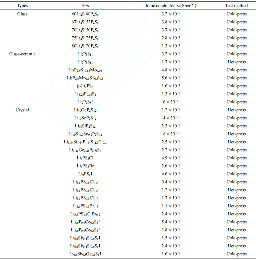硫化物固態(tài)電解質(zhì)按照組成主要可以分為兩類,一類是二元硫化物電解質(zhì)由Li2S和P2S5組成,比如Li3PS4和Li7P3S11;一類是三元硫化物固態(tài)電解質(zhì)由Li2S、P2S5和MS2(M=Si、Ge、Sn),如Li10GeP2S12和Li6PS5X(X=Cl、Br和I)。根據(jù)晶體結(jié)構(gòu),硫化物固態(tài)電解質(zhì)可以被分為為玻璃態(tài)、玻璃陶瓷態(tài)和晶態(tài)。