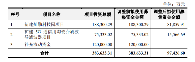 據悉,燦勤科技2020年申請科創板IPO,擬投入募集資金38.36億元,用于新建燦勤科技園項目、擴建5G通信用陶瓷介質波導濾波器項目。其中,新建的燦勤科技園項目總投資18.83億元,該項目包含三個子項目分別為:“介質波導濾波器產能擴張項目”、“新建HTCC、LTCC產品線項目”、“新建電子陶瓷研究院項目”。